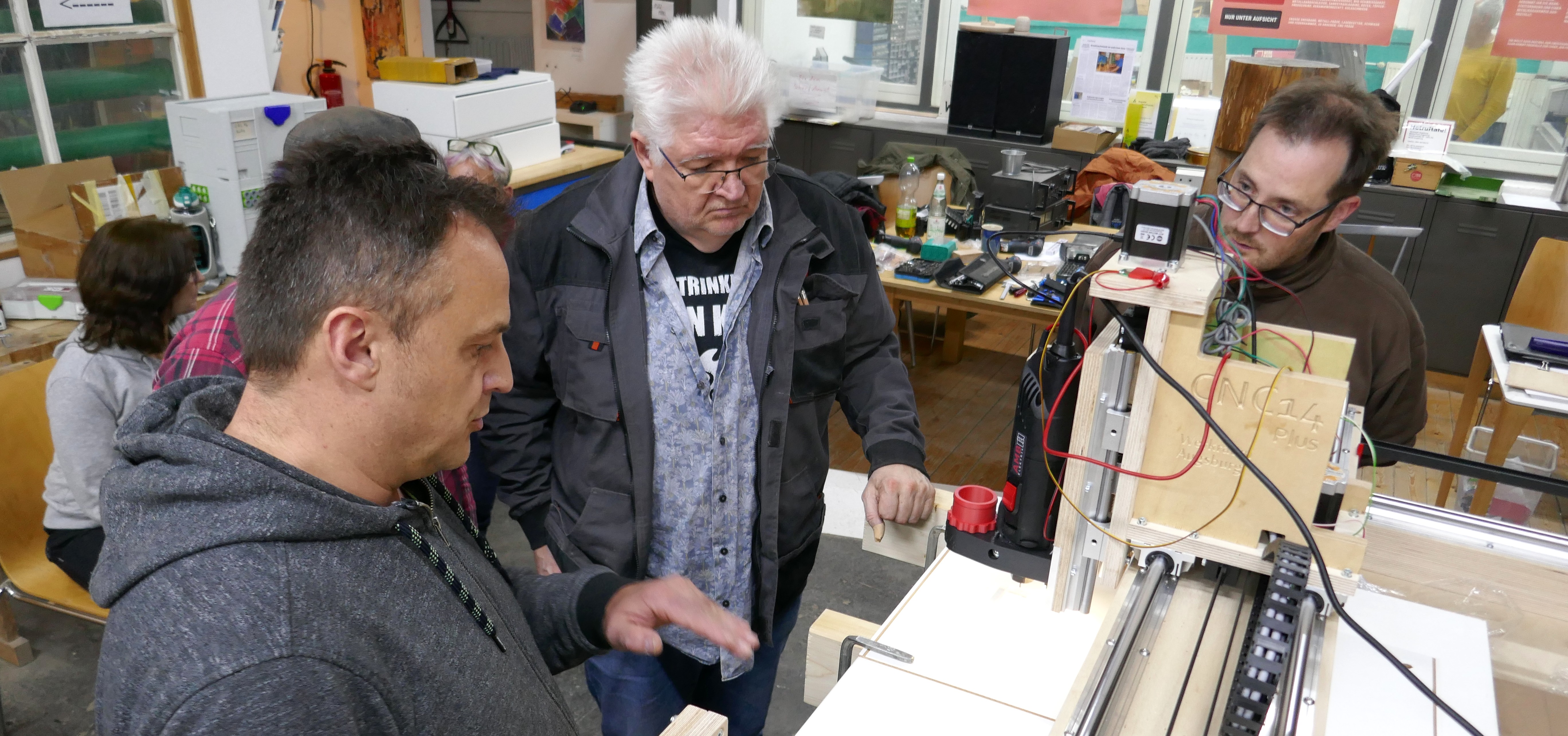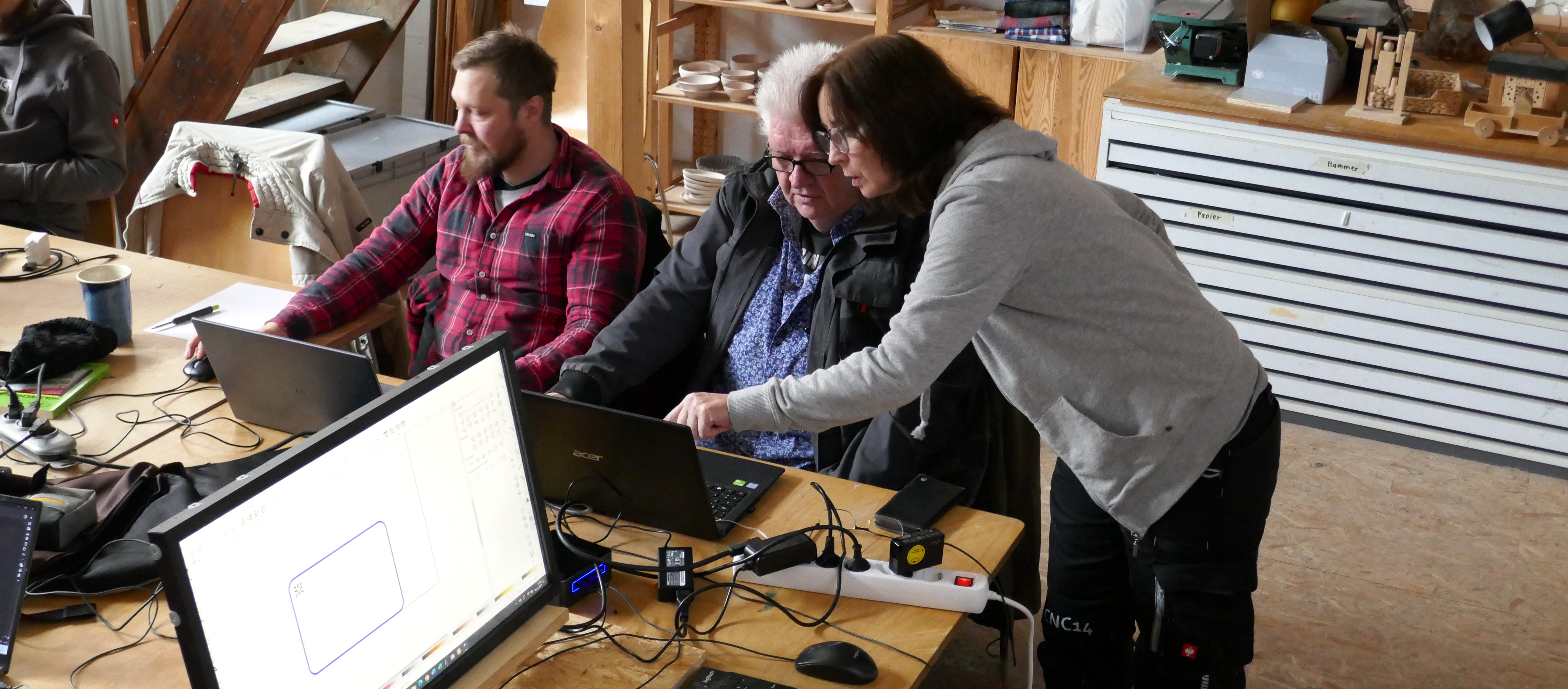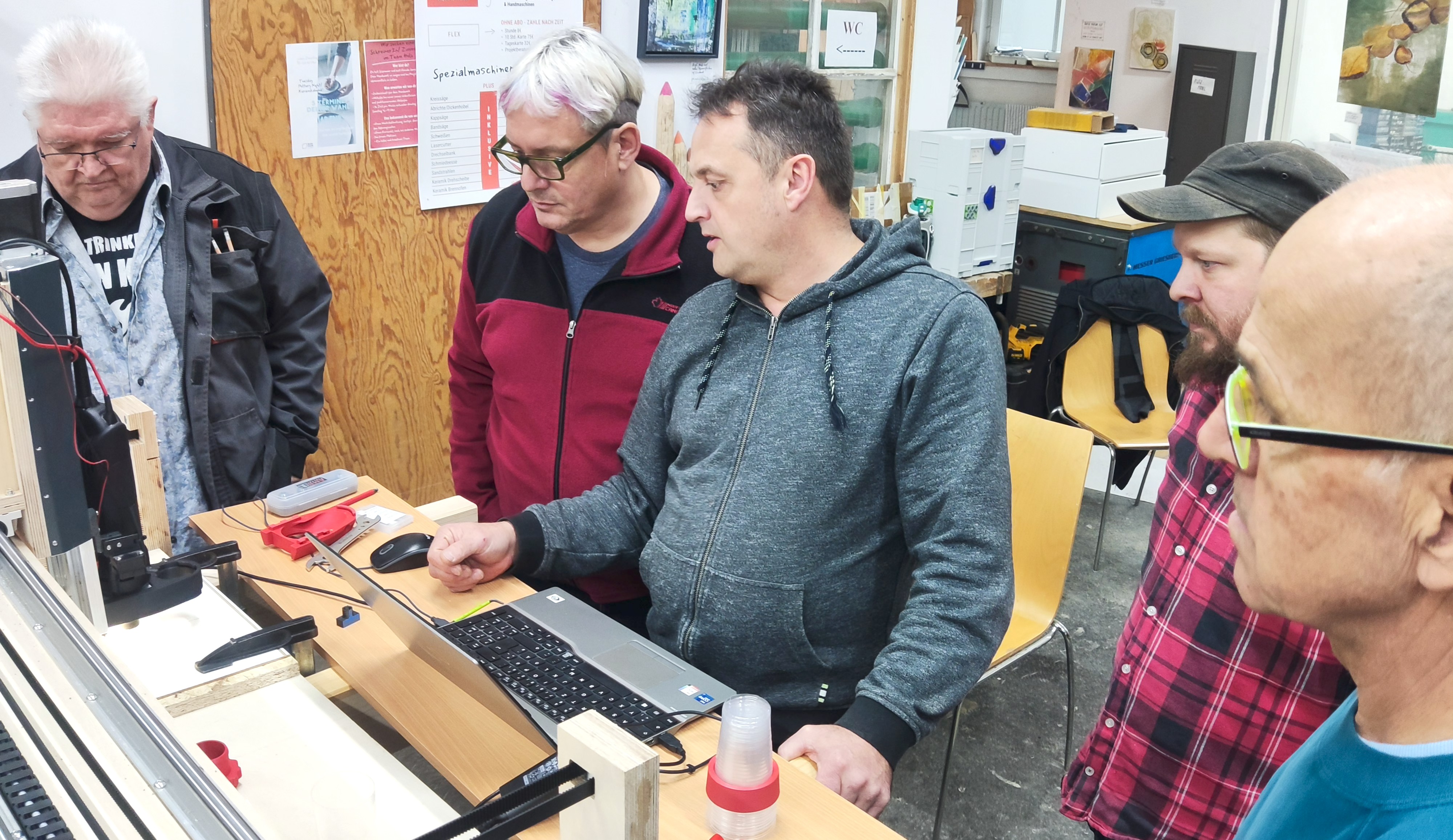Der letzte Tag des Workshops begann mit einer Einführung in die ersten Schritte an der Fräse. Ein weiterer ehemaliger Teilnehmer kam gemeinsam mit seiner Frau, um den Einführungstag ein zweites Mal zu erleben.